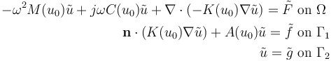 其中,在兩組方程之間有一個(gè)一般域的耦合項(xiàng) Q。為了簡(jiǎn)單起見,省略了靜態(tài)成分。同時(shí)請(qǐng)記住,所有的材料屬性都可以依賴于頻率,因此對(duì)于不同的諧波也會(huì)有所不同。現(xiàn)在,我們所具有的是一組帶有非線性耦合項(xiàng)的控制偏微分方程。求解這些方程只需要尋找我們?cè)谇蠼馄飨盗形恼轮薪榻B的同樣的求解方法。