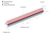 圖1一個電池堆中的固體氧化物燃料電池幾何結構,包括雙極板(上)。模型幾何結構是一個包括一個空氣流道和一個氫氣流道(下)的基本單元。假設雙極板處于恒定電勢,并且不包括在模型中。電勢被設置為多孔氣體擴散電極(GDE)和雙極板之間接觸表面的邊界條件。該模型包括以下方面的完整耦合: