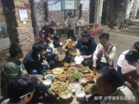 今晚的飯菜真是太豐盛了,牛肉、馬肉、驢肉、乳餅,還有許多叫不出名字的撒尼美食,菜蔬,盛裝的器皿也非常精致,有特色,晚上備了兩桌,姑娘們一桌,阿黑哥們一桌,曾老師拉我坐在身邊,給我倒上了滿滿的一大碗白酒。