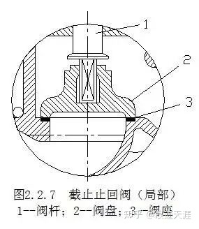 截止止回閥是具有截止和止回(阻止工作介質(zhì)逆向流動(dòng))雙重作用的閥件。它的閥體、閥蓋等和截止閥完全一樣,與截止閥不同的僅僅是閥盤2和閥桿1的結(jié)構(gòu),它的閥盤并不固接在閥桿上,而是由帶有止動(dòng)凸肩的閥桿松插在閥盤的導(dǎo)孔中央,如圖2.2.7所示。