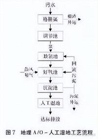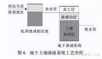 13、地下土壤滲濾系統:該系統將污水投配到土壤表面具有一定構造的滲濾溝中,污染物通過物理、化學、微生物的降解和植物的吸收利用得到處理和凈化。工藝流程見圖6。