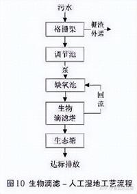 本技術適用于處理要求一般,規模較小,距離居民區較遠的污水處理設施,處理規模10~30噸/天。工藝參數:集水池停留時間不小于12h,缺氧池停留時間不小于12h,生物濾塔負荷0.2~0.3m3/(㎡˙d),人工濕地水力負荷0.5~1.0/(m2˙d),污泥理周期180天,工藝流程見圖10。
