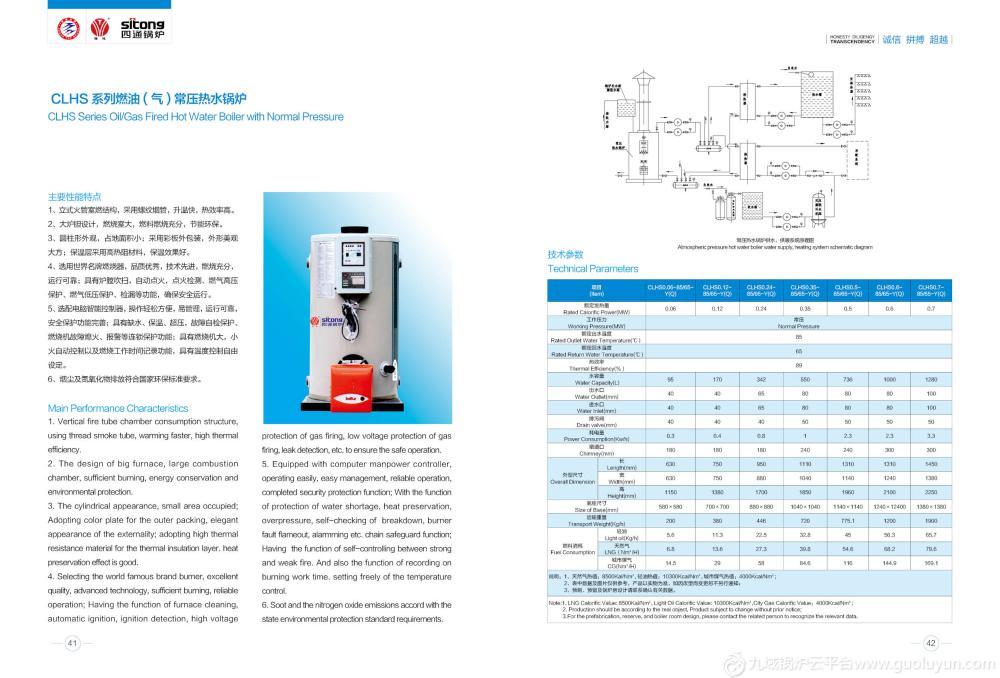 鍋爐配備國際先進的進口燃燒器,燃燒充分,煙氣中的有害成分低于國家標準,屬于環保產品。 技術參數 一、技術參數表(0.5噸-3噸) Technical parameter list型號WNS0.5 -1.0WNS0.75-1.0WNS1.0-1.25WNS1.5-1.25WNS2-1.25WNS3-1.25項目參數額定蒸發量(T/H)0.50.7511.523額定工作壓力(MPa)0.7/1.0/1.25/1.60.7/1.0/1.25/1.60.7/1.0/1.25/1.60.7/1.0/1.25/1.60.7/1.0/1.25/1.60.7/1.0/1.25/1.6出/回水溫度152(175)℃175(184)℃184℃184℃194℃設計效率(%)88%-92%水容積(m3)1.21.562.102.72.75.9滿水重量(t)4.48(5)5.76(6.2)6.48(7.1)8(8.4)8(8.4)16(16.8)耗電功率(KW)3.63.65.915.817.719.7電源(V)380適用燃料輕油、天然氣、重油、城市煤氣、石油液化氣計算耗量: