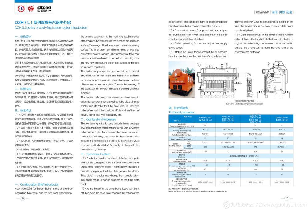 (mm)250300320360360360★注★:我們將盡可能地在本網站提供準確的信息。本網站內所涉及的產品圖片與實物可能有細微區別,效果演示圖和示意圖僅供參考,有關四通鍋爐集團產品的外觀( 包括但不限于顏色 )請以實物為準。產品價格、規格、型號、供應狀況如有更改,恕不另行通知。 二、技術參數表(4噸-20噸) Technical parameter list型號WNS4-1.25